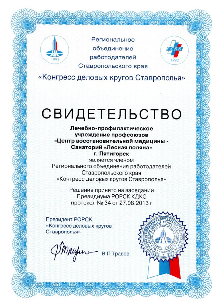 Свидетельство Регионального объединения работодателей Ставропольского края «Конгресс деловых кругов Ставрополья», 2013 г.