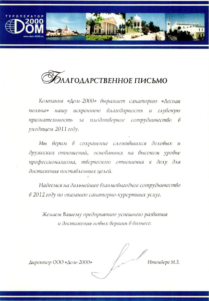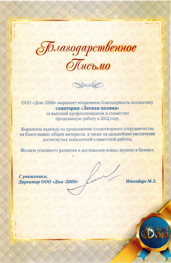 Благодарственное письмо от ООО «Дом-2000», 2012 г.
