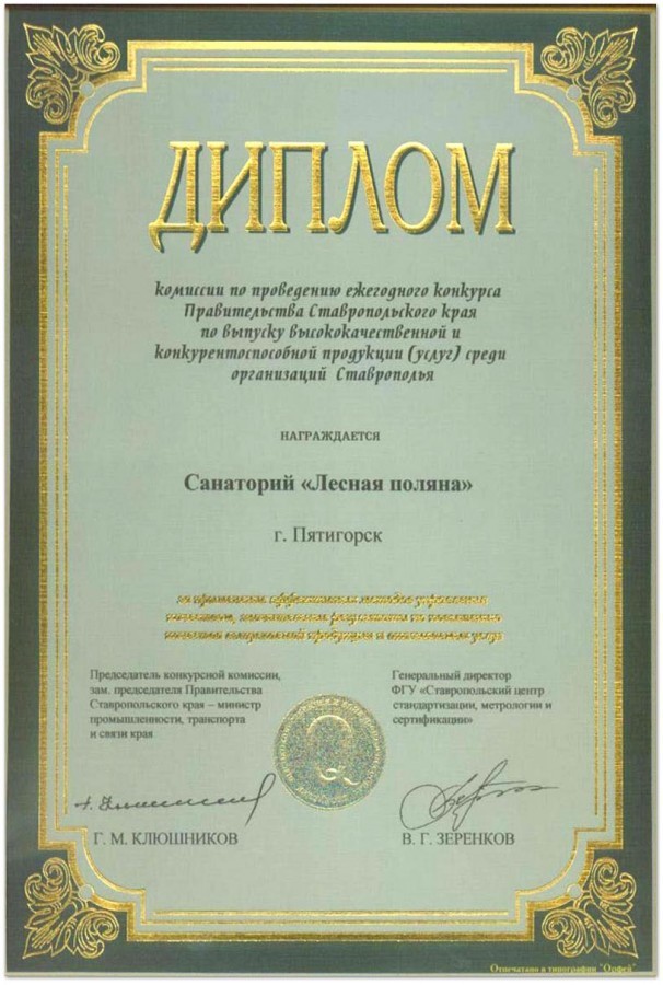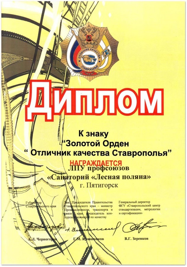 Диплом к знаку «Золотой орден «Отличник качества Ставрополья»