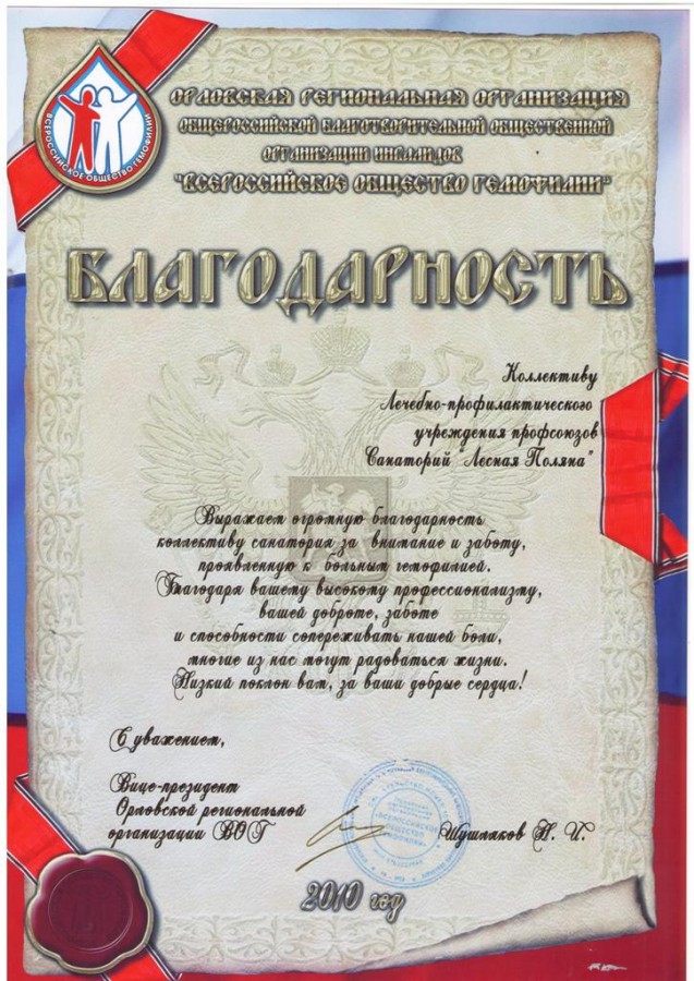 Благодарность Орловской региональной организации «Всероссийское общество гемофилии», 2010 г.