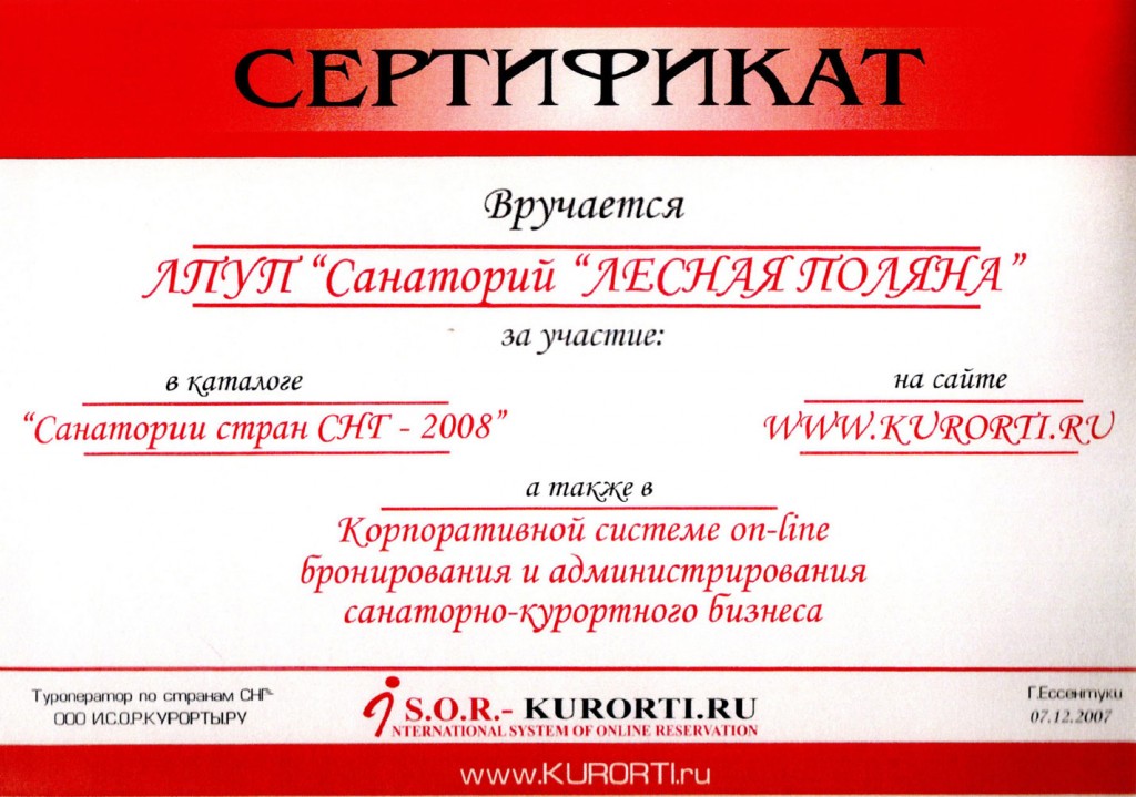 Сертификат участия в каталоге «Санатории стран СНГ — 2008» 2007 г.