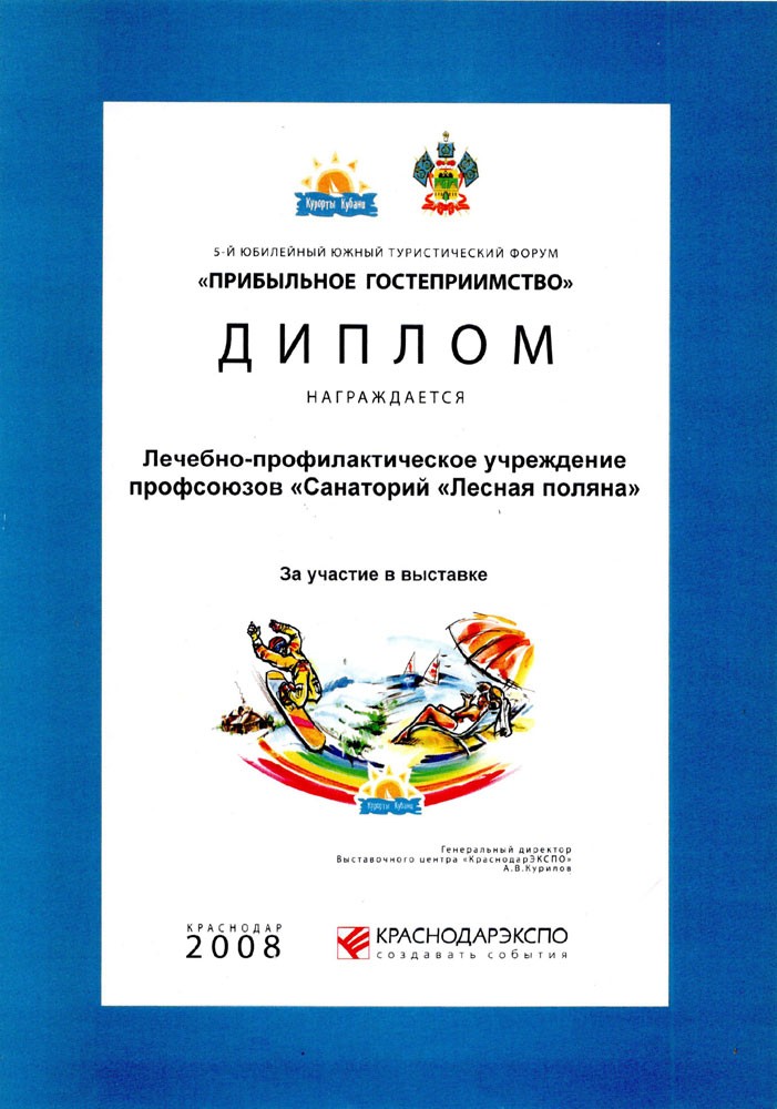 Диплом 5 юбилейного южного туристического форума «Прибыльное гостеприимство» 2008 г.